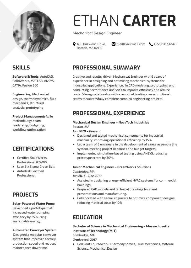 Featuring a modern, clean, and ATS-friendly layout, this mechanical engineer resume ensures your profile is easily readable by recruiters and compatible with applicant tracking systems used by top engineering firms. The structured design highlights essential skills such as mechanical design, CAD software, project execution, equipment maintenance, quality control, and process optimization.